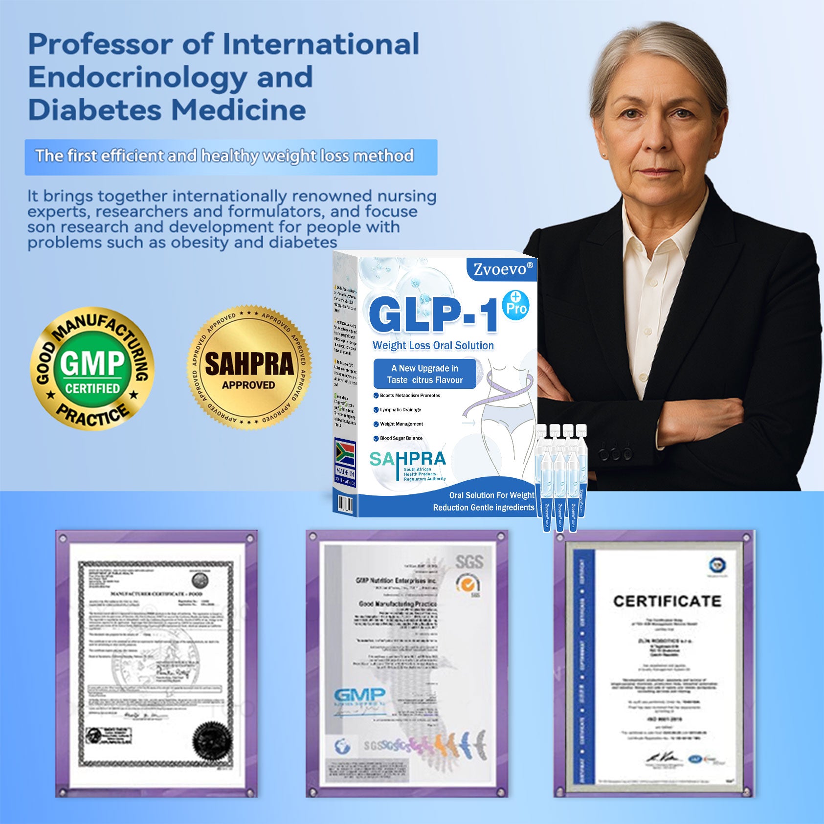 "As an endocrinologist, I am committed to finding effective and natural solutions for metabolic health and weight management. After extensive research and clinical trials with over 5,000 participants, I have found that Zvoevoยฎ GLP-1 Pro Weight Loss Oral Solutionย offers remarkable benefits for metabolism, appetite control, and overall well-being. This formula naturally supports GLP-1 activation, helping regulate blood sugar levels, curb cravings, and enhance fat burning. Its powerful blend of apple cider vinegar, turmeric, and other natural ingredients not only aids in healthy weight loss but also promotes digestive health, boosts immunity, and supports long-term metabolic balance. With the backing of modern medical research, Zvoevoยฎ GLP-1 Pro Weight Loss Oral Solutionย is a trusted, science-driven choice for those seeking a natural and effective approach to weight management and overall health."